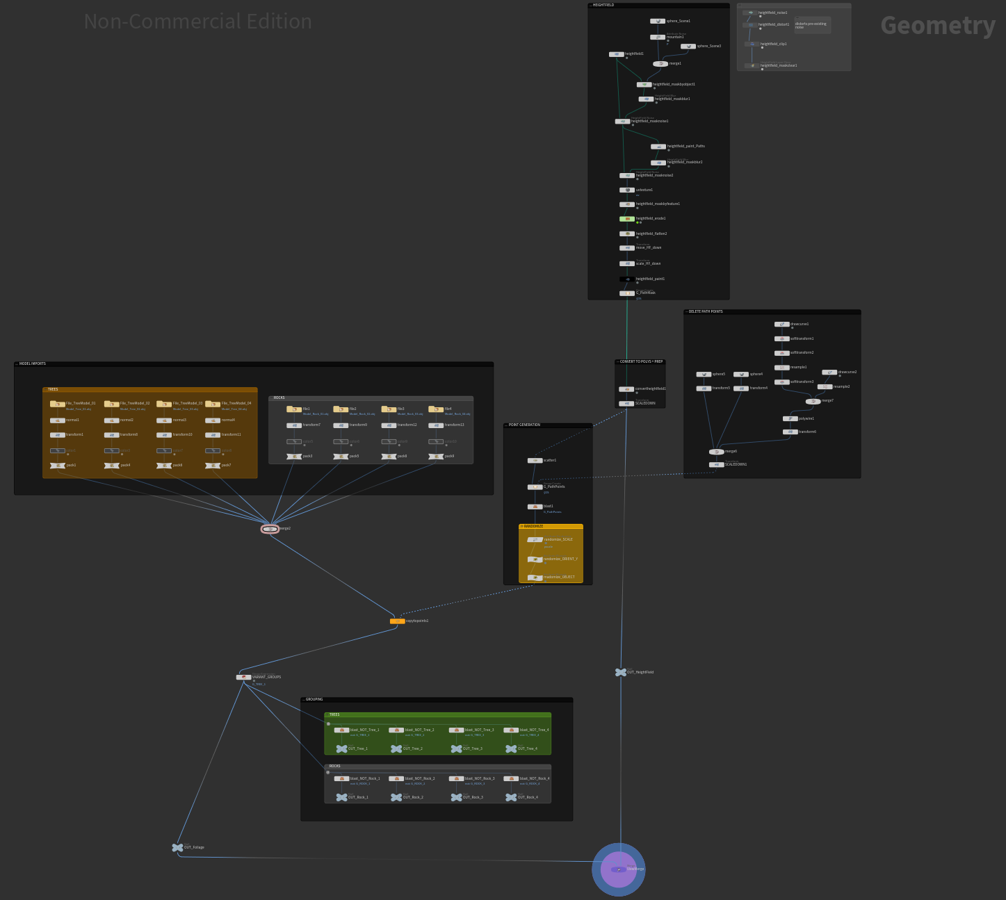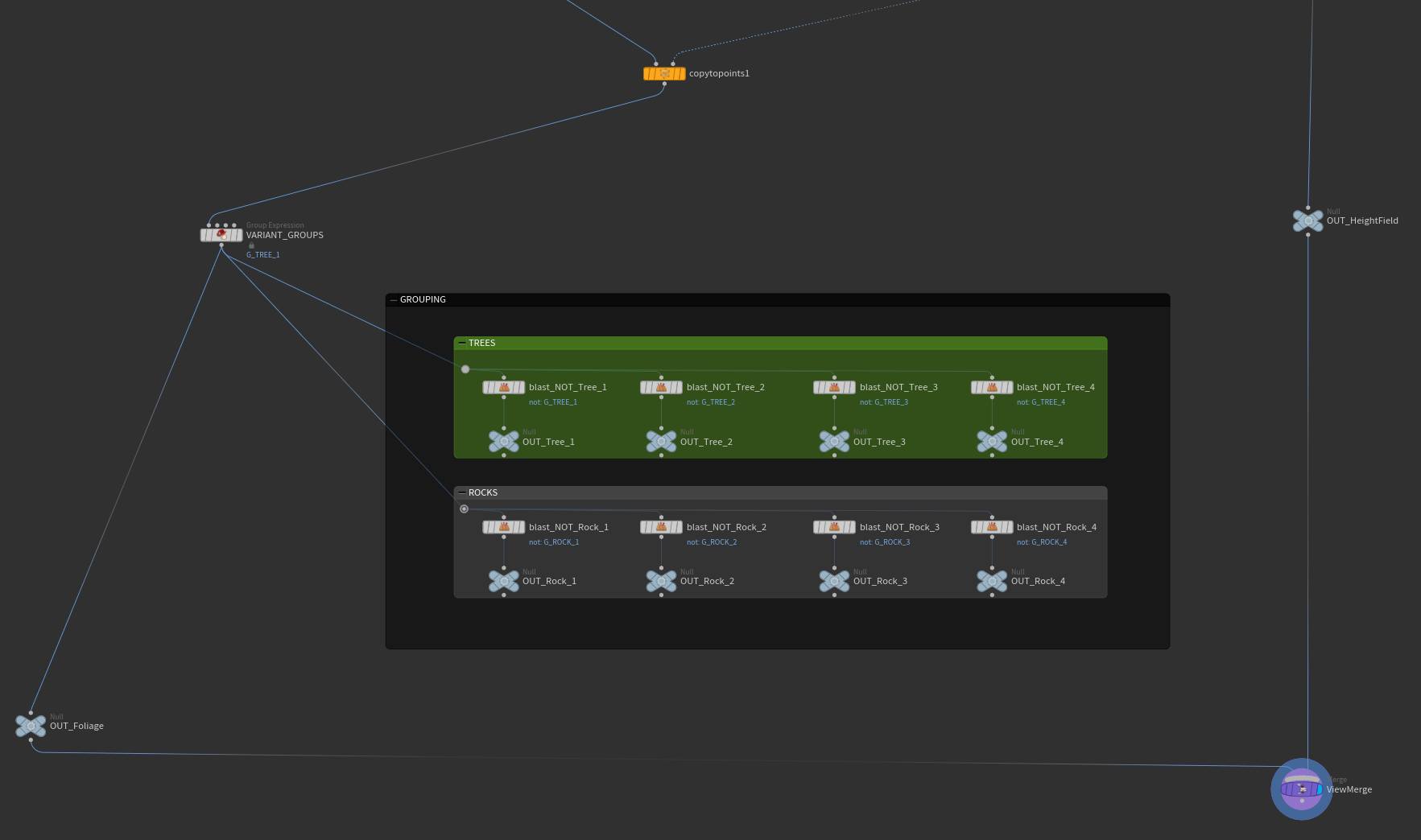 Close-up screenshots of nodes importing the 8 different models set up so far, 4 tree and rock models. Then they are grouped to be brought in to Solaris stage separately.
