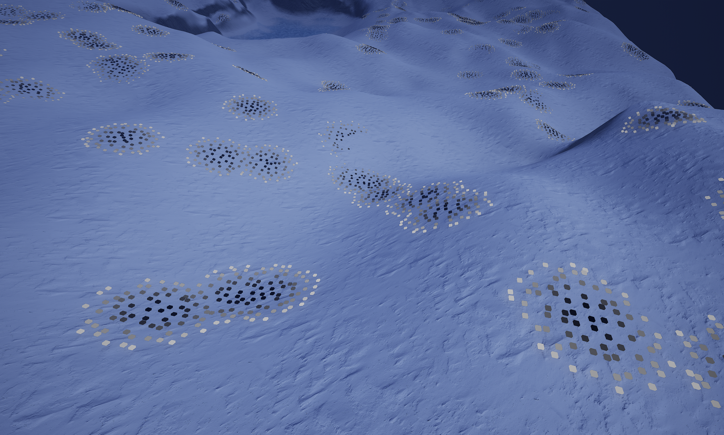 In the graph tree above you can see how each object category is organized and labeled. The graph pulls height and normal data from the landscape to generate random points, and by using noise, density filters, and also scaling by density the points can be adjusted in different ways.